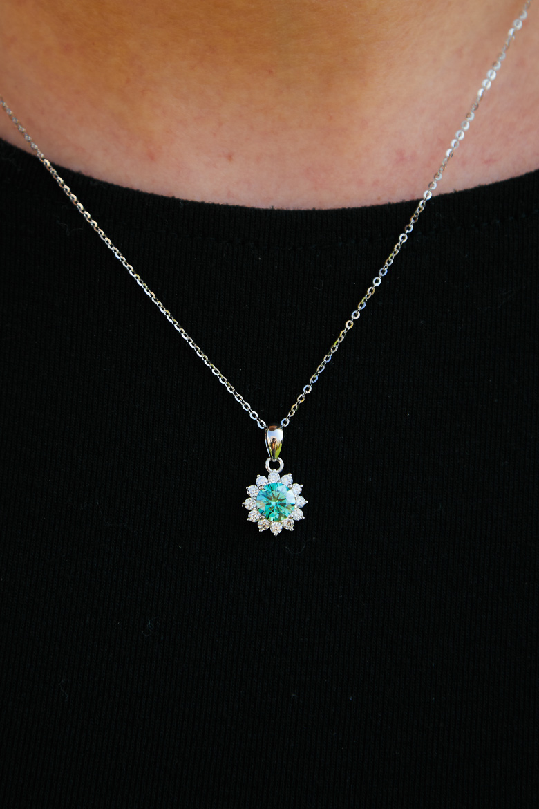 שרשרת כסף משובץ באבני מויסינייט עם אבן ראשית ירוקה